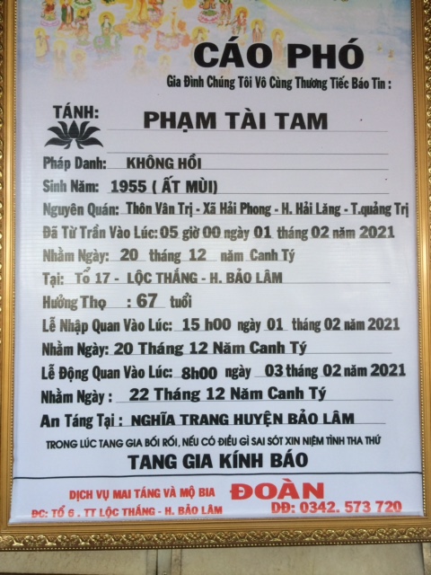 BỐ CỦA ĐIỀU DƯỠNG PHAN THỊ THU HÀ ĐÃ TỪ TRẦN VÀO LÚC 5 GIỜ NGÀY 01 THÁNG 02 NĂM 2021